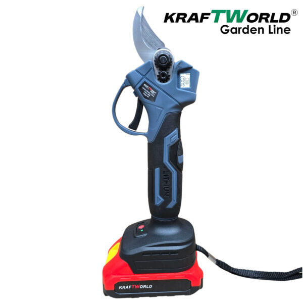 Професионалната лозарска ножица KraftWorld е оборудвана с LCD дисплей, който показва броя на извършените срезове и нивото на батерията, осигурявайки пълен контрол върху работата ви. С четири регулируеми степени на отваряне на ножовете, можете да адаптирате ножицата според дебелината на клоните, което оптимизира ефективността и удължава живота на инструмента. Смяната на степените се извършва лесно чрез задържане на спусъка до звуков сигнал. Максималният диаметър на рязане е до 33 мм, което позволява прецизно подрязване на лозови пръчки, клони и храсти.