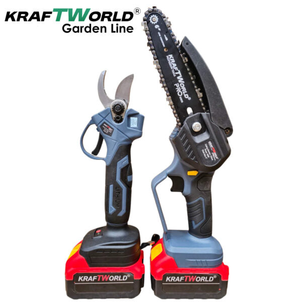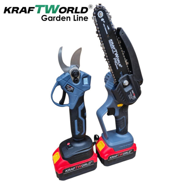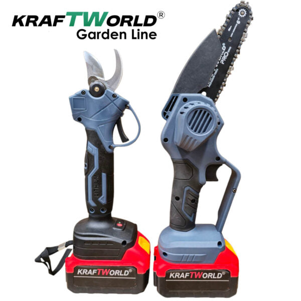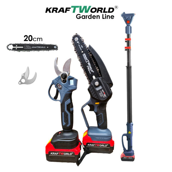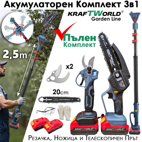 Представяме ви Акумулаторния градински комплект KraftWorld 3 в 1 – професионално решение за ефективна и безопасна поддръжка на вашата градина, лозе или овощна градина. Този универсален комплект включва акумулаторна лозарска ножица с LCD дисплей и четири степени на отваряне, мини резачка с шина 8″ и верига, и телескопичен прът за достигане на високи клони.