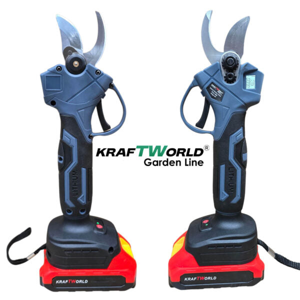 Професионалната лозарска ножица KraftWorld е оборудвана с LCD дисплей, който показва броя на извършените срезове и нивото на батерията, осигурявайки пълен контрол върху работата ви. С четири регулируеми степени на отваряне на ножовете, можете да адаптирате ножицата според дебелината на клоните, което оптимизира ефективността и удължава живота на инструмента. Смяната на степените се извършва лесно чрез задържане на спусъка до звуков сигнал. Максималният диаметър на рязане е до 33 мм, което позволява прецизно подрязване на лозови пръчки, клони и храсти.