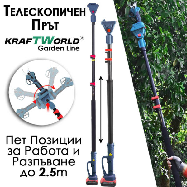 Телескопичен прът за лесно достигане на високи клони.