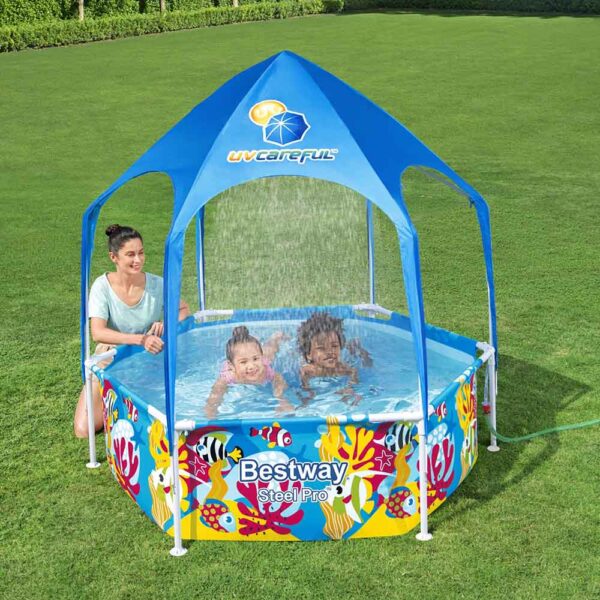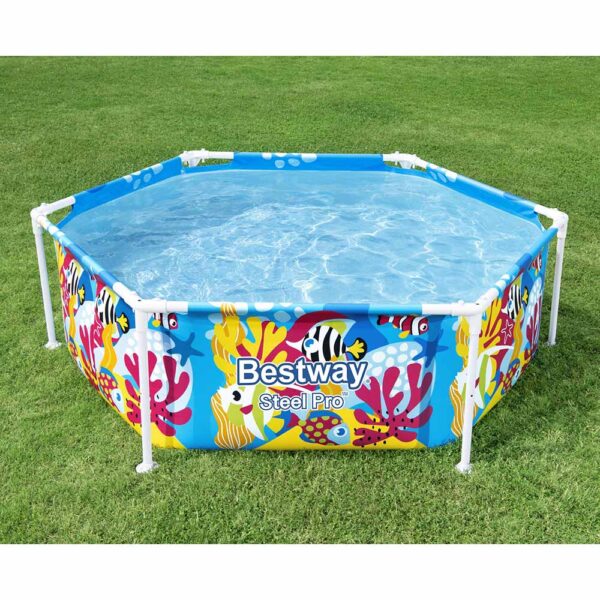 Сглобяемият басейн BESTWAY Steel Pro е идеалното решение за горещите летни дни. Със своя компактен размер и здрава конструкция, той осигурява прохлада и забавление за цялото семейство. Изработен е от висококачествени материали, които гарантират дълготрайна и надеждна употреба. Покривът осигурява защита от пряката слънчева светлина, което го прави още по-удобен за децата и възрастните.