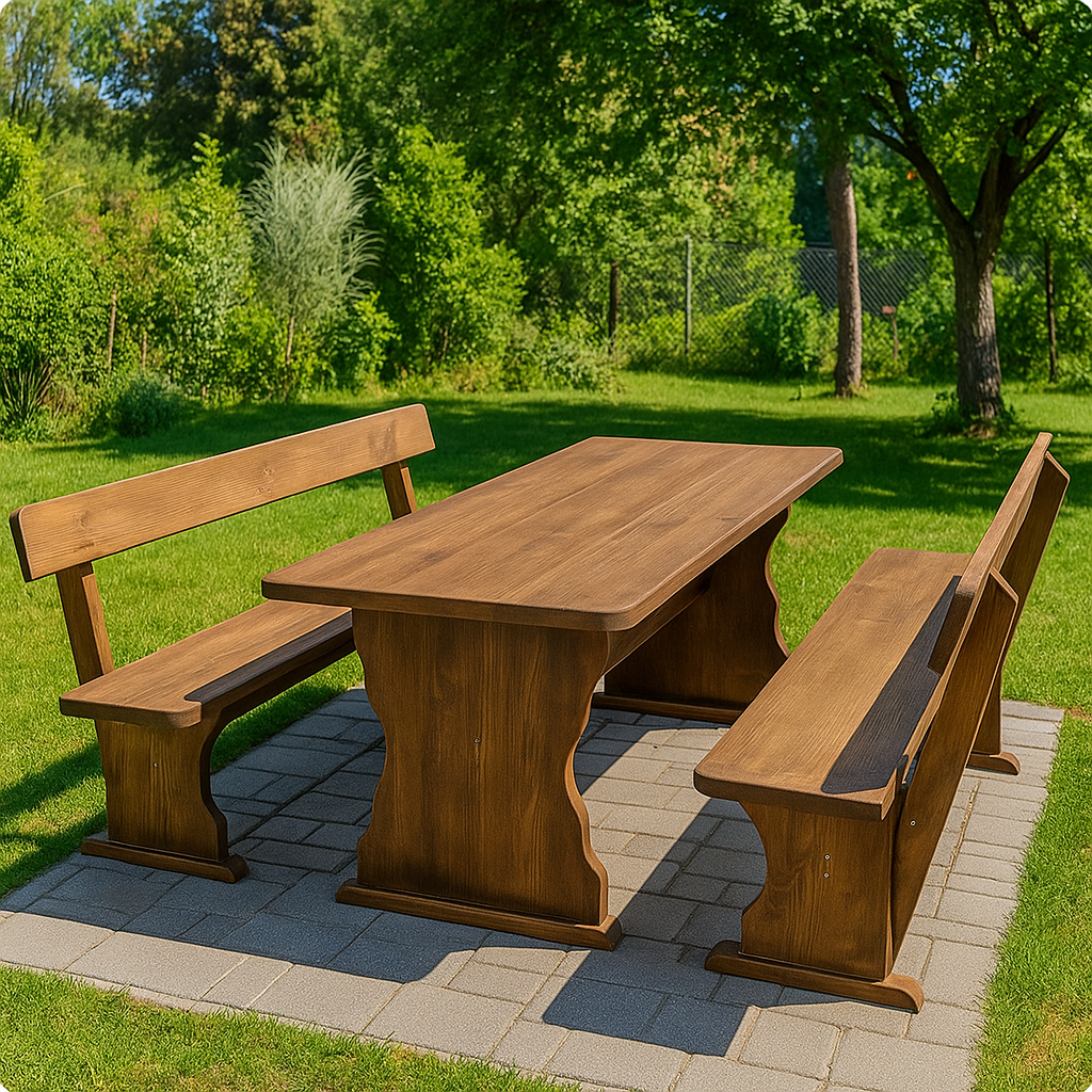 Импрегнираният градински комплект „Баварски“ включва маса и две пейки от висококачествена масивна иглолистна дървесина, обработена с дълбок импрегнант за повишена устойчивост на влага, UV лъчи и насекоми. Това прави комплекта идеален за външна употреба – дворове, градини, заведения и обществени зони за отдих.