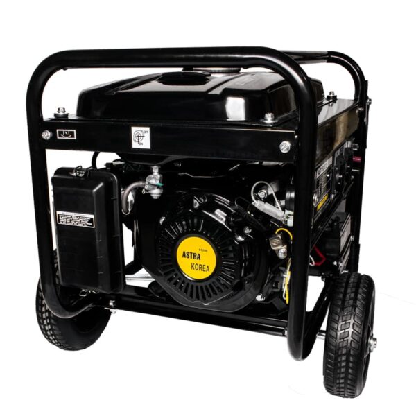 Генератор за ток ASTRA KOREA 10880 е корейски агрегат за произвеждане и доставяне на електроенергия, която може да се употребява за задвижване на различни видове машини и апаратура, пригодени за работа с монофазна ел енергия. Този електрогенератор се задвижва от мощен бензинов мотор с четири такта, който се стартира, чрез електростартер или дистанционно с обхват до 1000м. Генератора е оборудван с магнетен стартер и акумулатор – зарежда се автоматично от генератора по време на работа. Произведената електроенергия от генератор на ток ASITRA може да се използва чрез двата контакта с изходно напрежение 230V и сила на тока 16 Ампера. Шумовите емисии са до 70 Децибела, с което той се нарежда сред по-тихите генератори за ток на пазара.