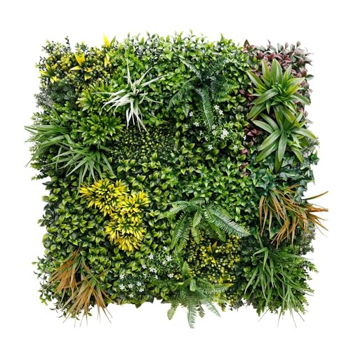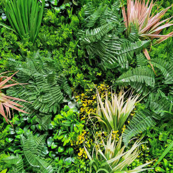 Този пъстър панел съчетава разнообразие от папрат, фаларис, сочни листа и цветни елементи в лилаво, жълто и бяло, което го превръща в изключително впечатляващ акцент за огради, стени и балкони.