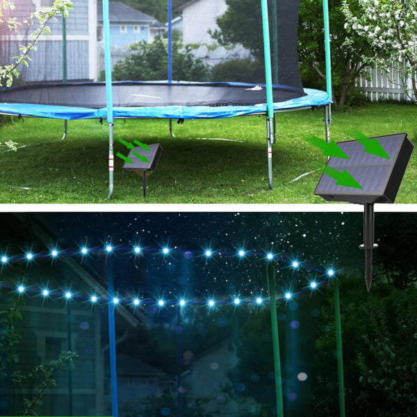Добави магия в двора с ефектна LED гирлянда, която се захранва от слънцето и автоматично се включва при здрач. Светлините обгръщат целия горен ръб на мрежата и създават истинска празнична атмосфера – перфектна за вечерни игри, снимки или дори детско парти. Красиви, функционални и напълно без нужда от ток!