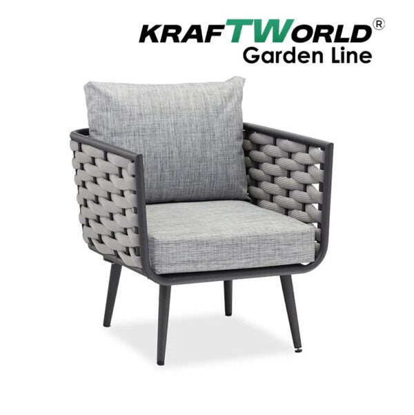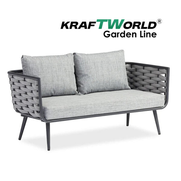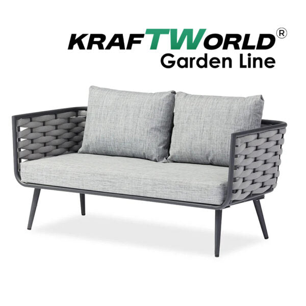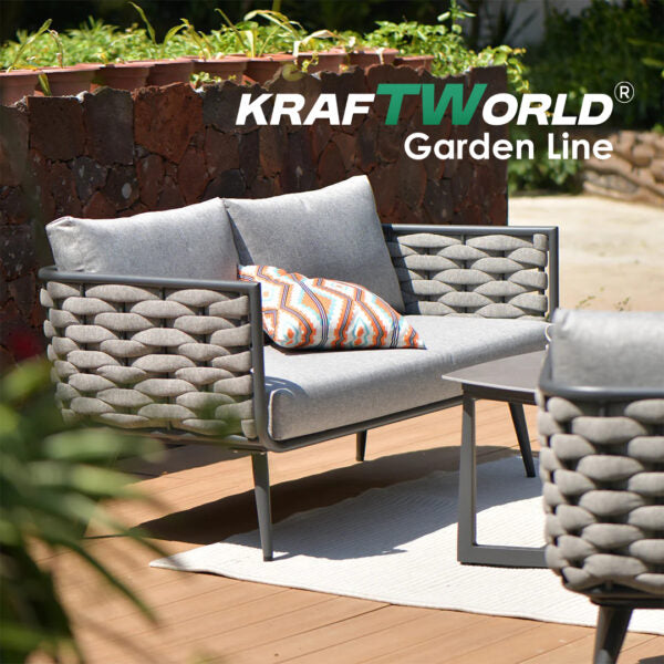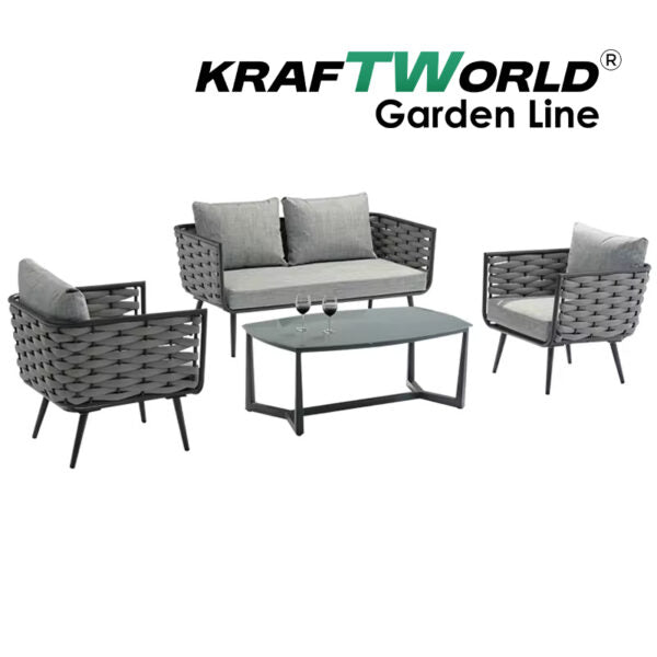 Този стилен сет включва комфортен двуместен диван, две кресла и маса със стъклен плот, които съчетават модерен дизайн с функционалност и устойчивост на атмосферни условия.