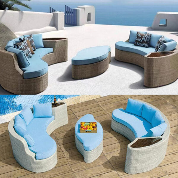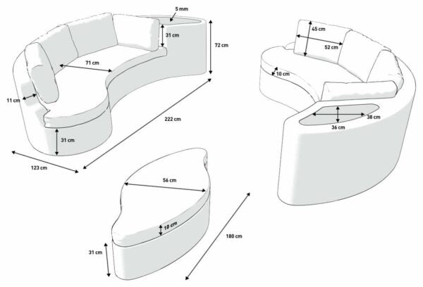 Комплектът включва два стилни дивана с изчистена извита форма, голяма табуретка/маса и вградени стъклени плотове върху подлакътниците, които осигуряват удобно място за напитки или аксесоари. Благодарение на интелигентния модулен дизайн можеш да подреждаш елементите според случая — като отделни кътове за сядане или като едно голямо, комфортно легло за релакс.