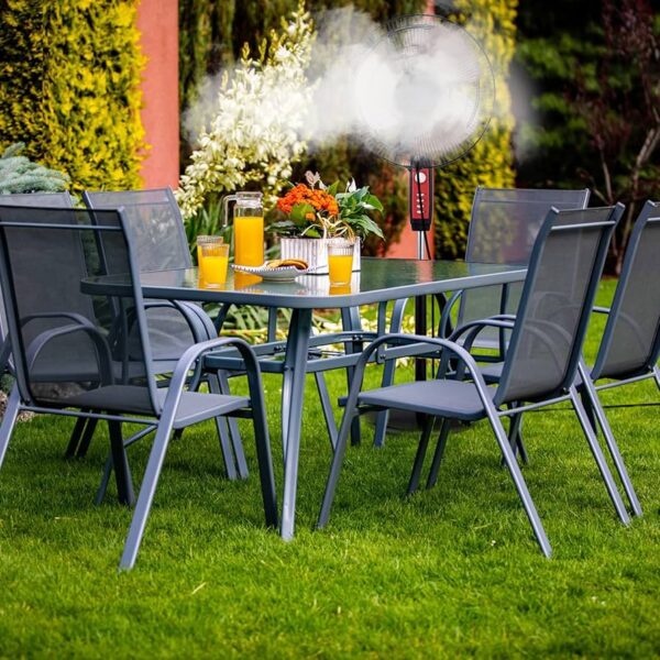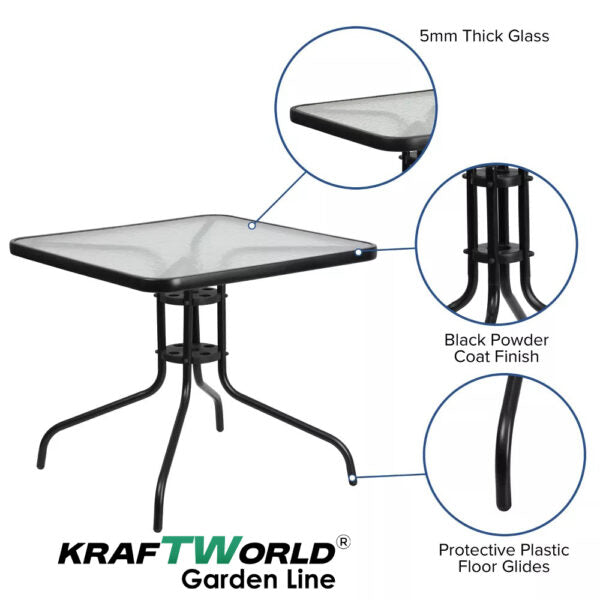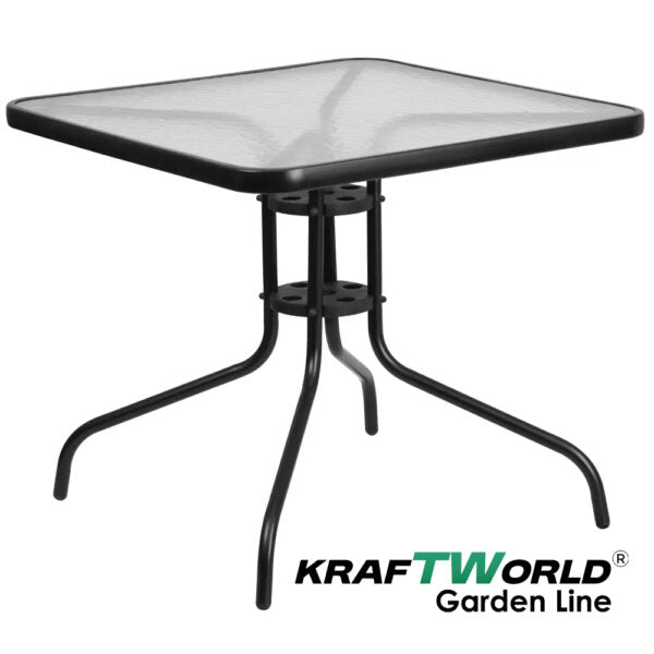 Масата е с компактни размери 80 x 80 x 70 см – квадратна форма, с метална рамка и термообработен стъклен плот, устойчив на атмосферни влияния. Централният отвор в плота позволява поставяне на чадър, ако желаете сянка.