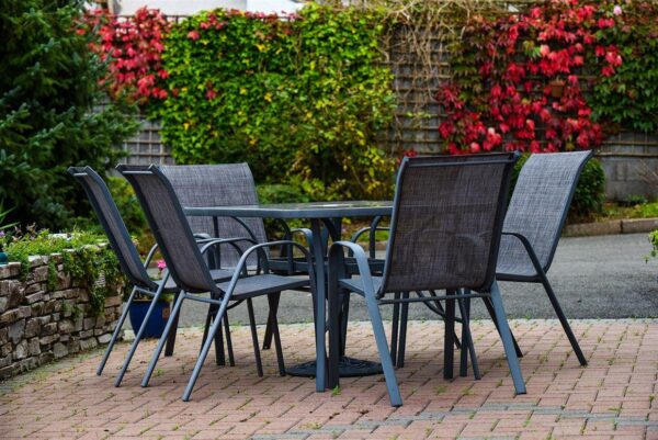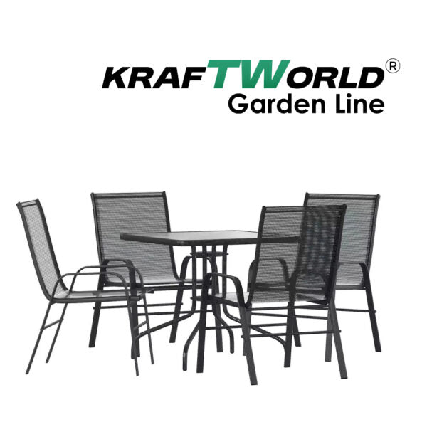 Столовете са същите като в по-големия комплект – изработени от здрав метал и обтегнат текстилен плат, който е устойчив на UV лъчи и влага. Облегалките са леко наклонени за повече комфорт при сядане, а конструкцията е лека и стабилна.
