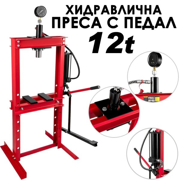 Хидравлична преса с педал 12 тона – манометър, стоманена рамка