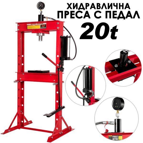 Хидравлична преса с педал 20 тона – манометър, регулируема маса
