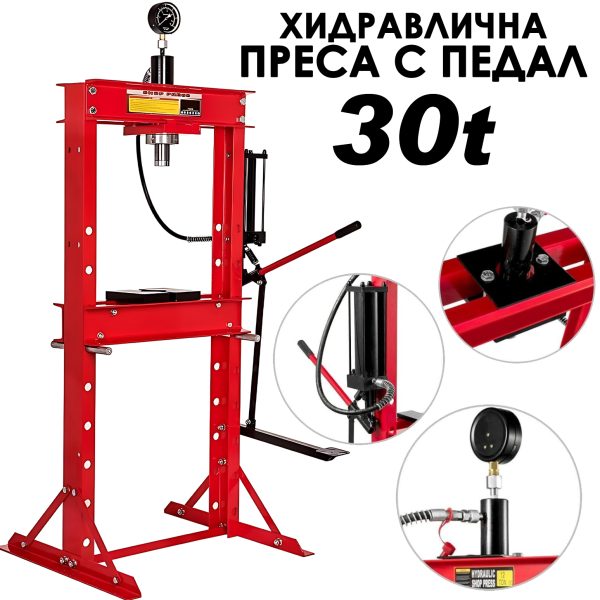 Хидравлична преса с педал 30 тона – манометър, регулируема маса
