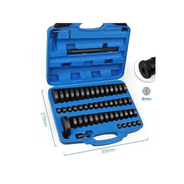 Комплектът KraftWorld 51 части е незаменим инструмент за професионални механици и домашни майстори. Той предлага пълен набор от дискове (от 18 до 65 мм), поддържаща основа и грип с набраздена дръжка, което го прави универсално решение за работа с лагери, втулки и уплътнителни пръстени. Изработен от висококачествена въглеродна стомана с черен оксид, комплектът осигурява здравина и дълготрайност.