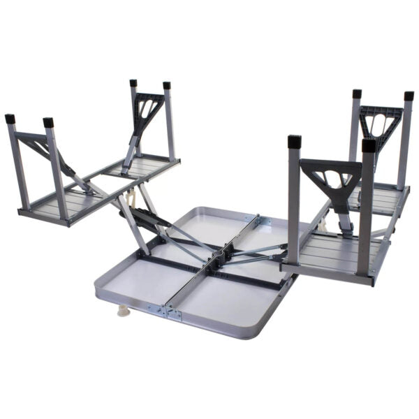 Не прави компромис с комфорта, когато си навън. С тази лека, но здрава къмпинг маса с вградени седалки получаваш всичко в едно – без допълнителен багаж, без сложен монтаж, без усилие.