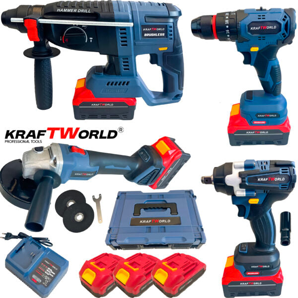 Съчетайте производителността и удобството с новия комплект от серията PowerMax на Kraftworld, включващ ъглошлайф, гайковерт, винтоверт и перфоратор. Всички инструменти работят с мощните литиево-йонни батерии, които са съвместими с всички инструменти от серията PowerMax Kraftworld, предоставяйки ви универсално и икономично решение за всички ваши нужди.