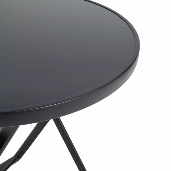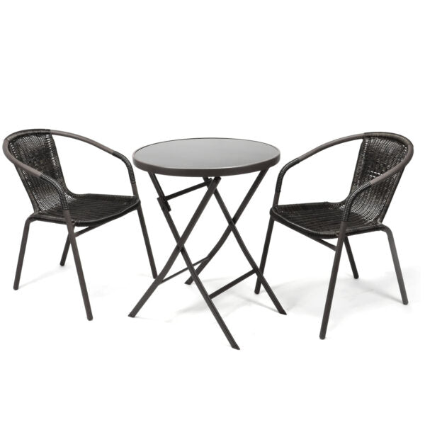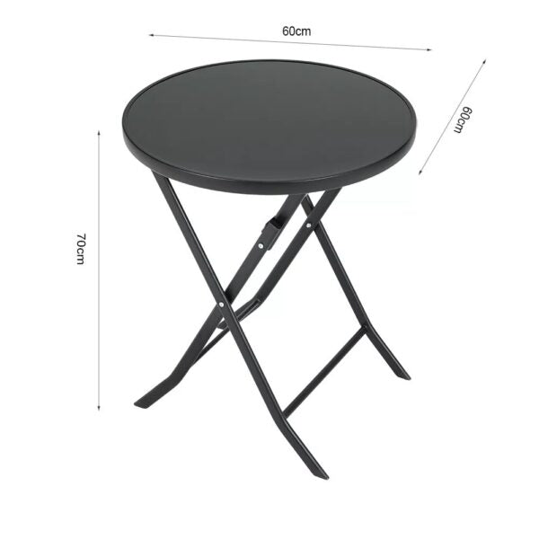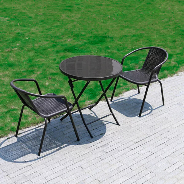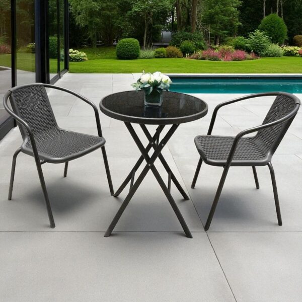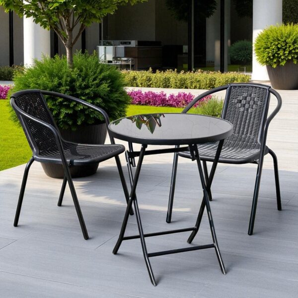 Създаден за уютни моменти на открито, този градински сет включва 2 комфортни стола и сгъваема кръгла маса с Ø60 см плот от закалено (темперирано) стъкло – издръжлива, безопасна и устойчива на надраскване.