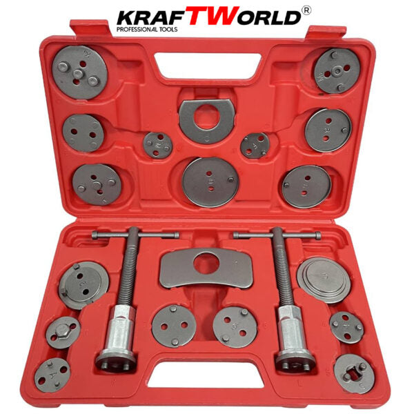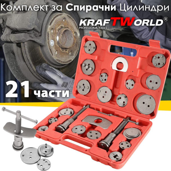 Комплектът за сваляне на спирачни цилиндри KrafTWorld е незаменим помощник за всеки професионален и любител механик. Със своите 21 части и възможност за работа както с ляво, така и с дясно въртене, този комплект предлага универсалност и удобство при ремонта на широка гама превозни средства. Висококачествените материали и магнитните глави гарантират стабилност и дълготрайност, докато практичният червен пластмасов куфар улеснява съхранението и транспортирането.