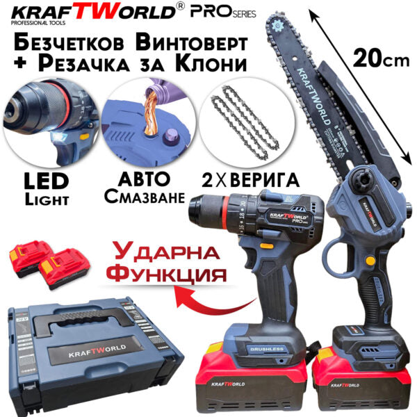 KraftWorld 2в1 Професионален Комплект – Ударен Винтоверт и Мини Резачка с Автоматично Омасляване