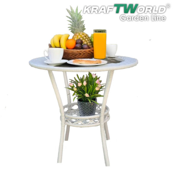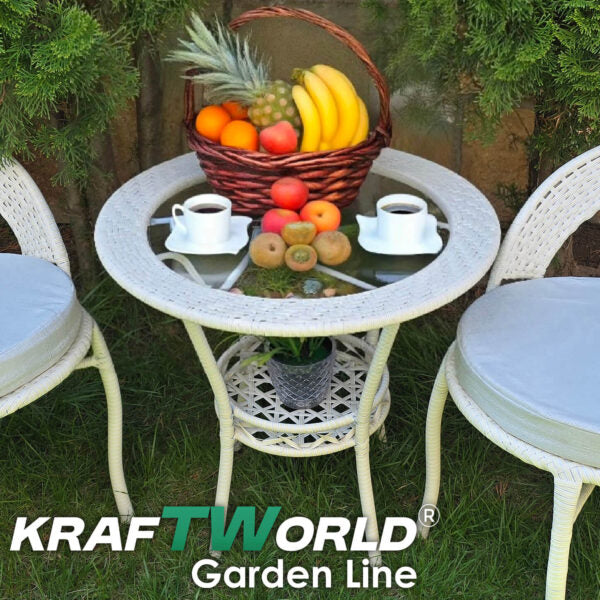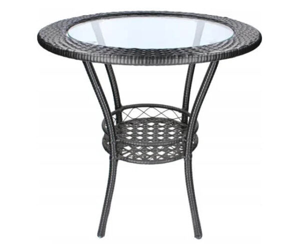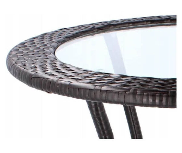Масата е изработена от висококачествен PVC ратан, устойчив на влага и UV лъчи, което я прави перфектна за целогодишна употреба. Здравата метална рамка гарантира стабилност, дори при интензивна употреба, а плотът от закалено стъкло с дебелина 8 мм придава изтънчен завършек и улеснява поддръжката – само едно забърсване и отново е като нова!