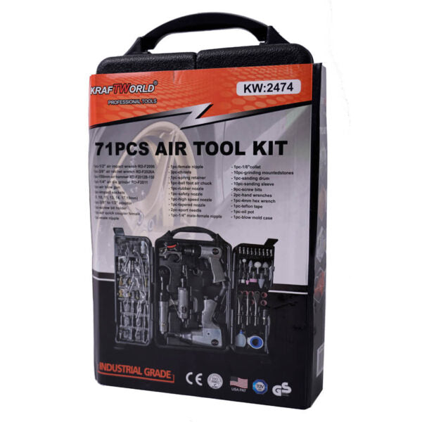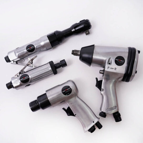 Открийте професионален комплект пневматични инструменти KraftWorld с 72 части, създаден за надеждност, удобство и висока производителност. Включва мощен ударен гайковерт 1/2″, тресчотка 3/8″, къртач, прав шлайф 1/4″, както и разнообразие от накрайници, битове, адаптери и аксесоари.