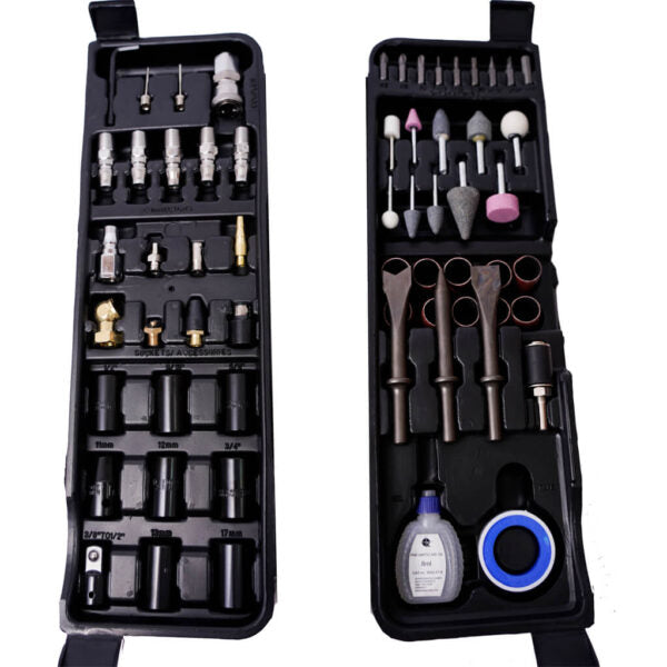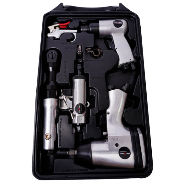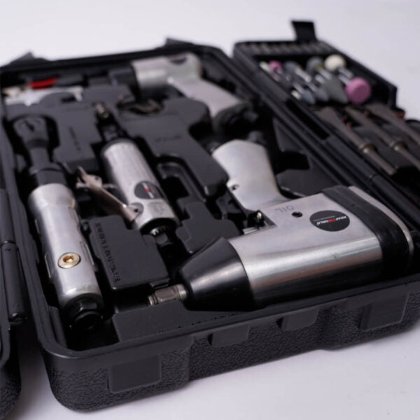 С този универсален комплект пневматични инструменти ще разполагате с всичко необходимо за бърз и ефективен ремонт, монтаж и обслужване на машини и превозни средства.