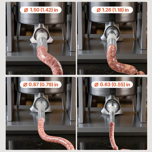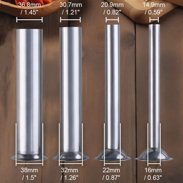 В комплекта са включени 4 различни фунии – 16 мм, 22 мм, 32 мм и 38 мм, всяка с дължина 19 см, така че лесно да подготвяте различни видове продукти – от тънки наденици до по-едри пълнежи.