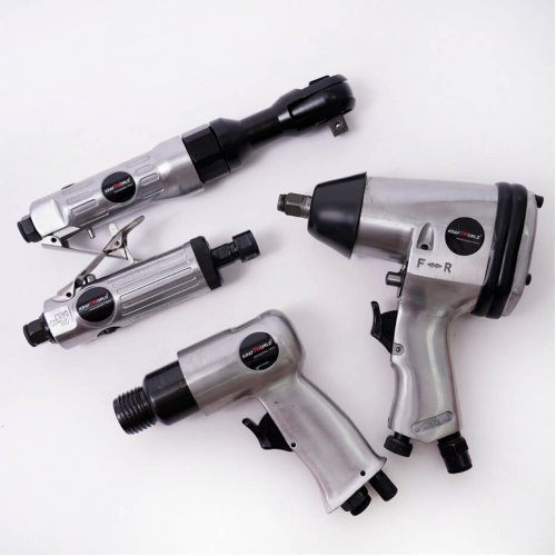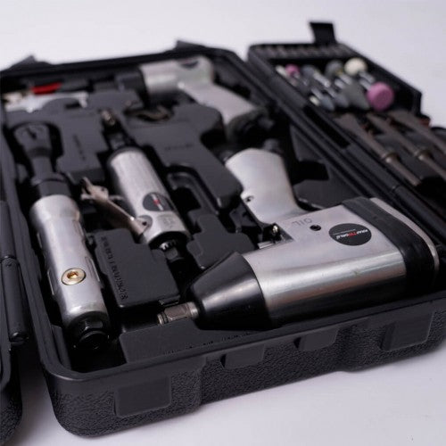 С този универсален комплект пневматични инструменти ще разполагате с всичко необходимо за бърз и ефективен ремонт, монтаж и обслужване на машини и превозни средства.