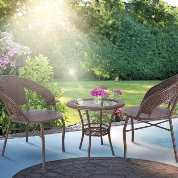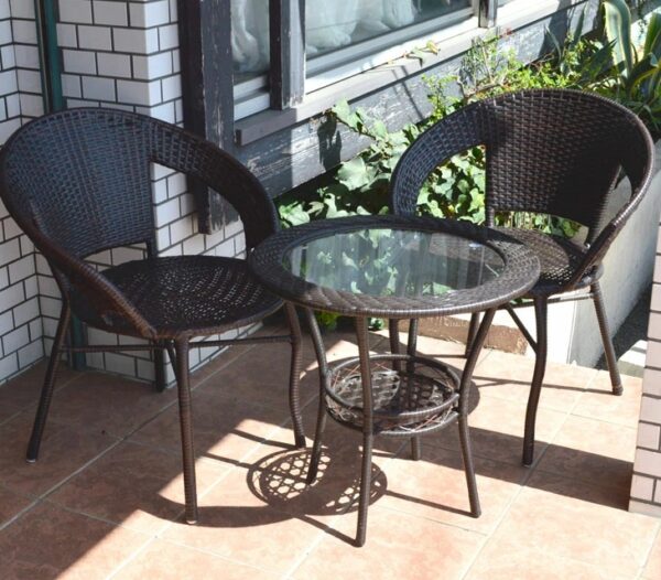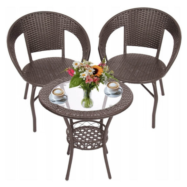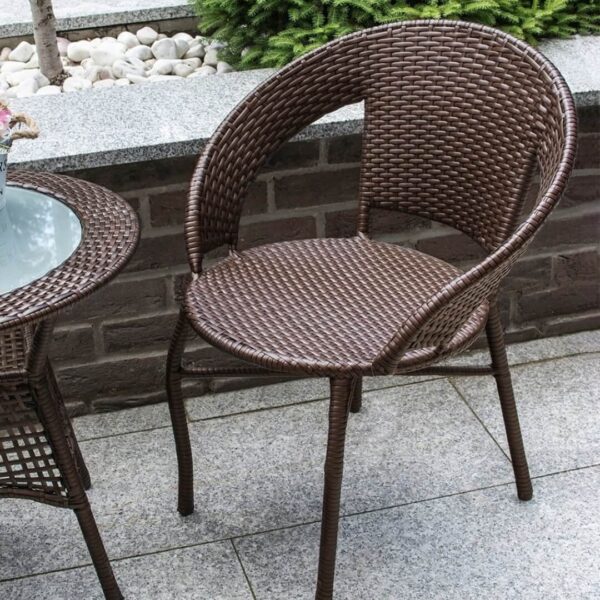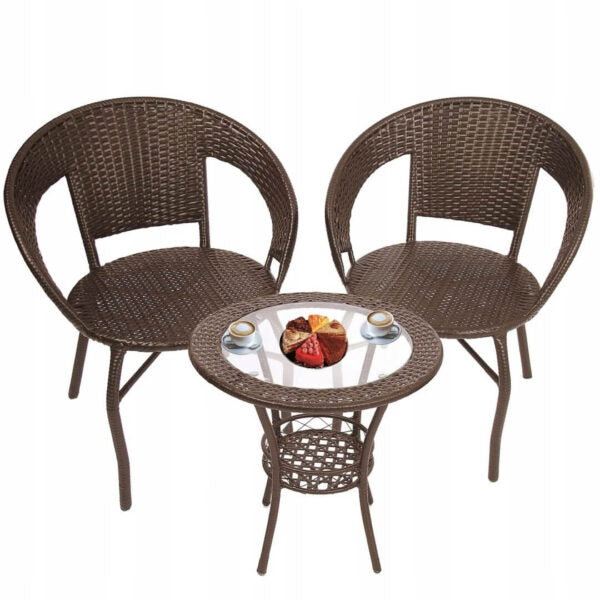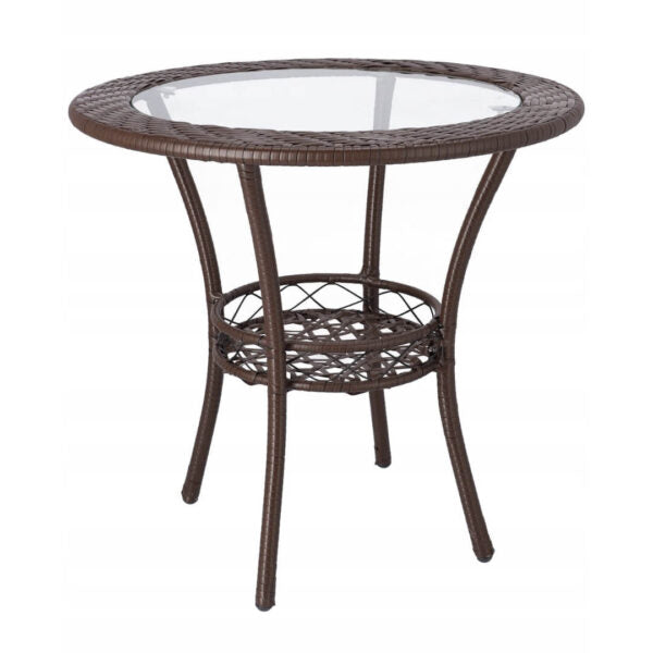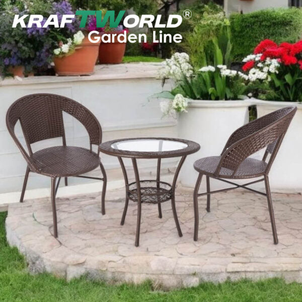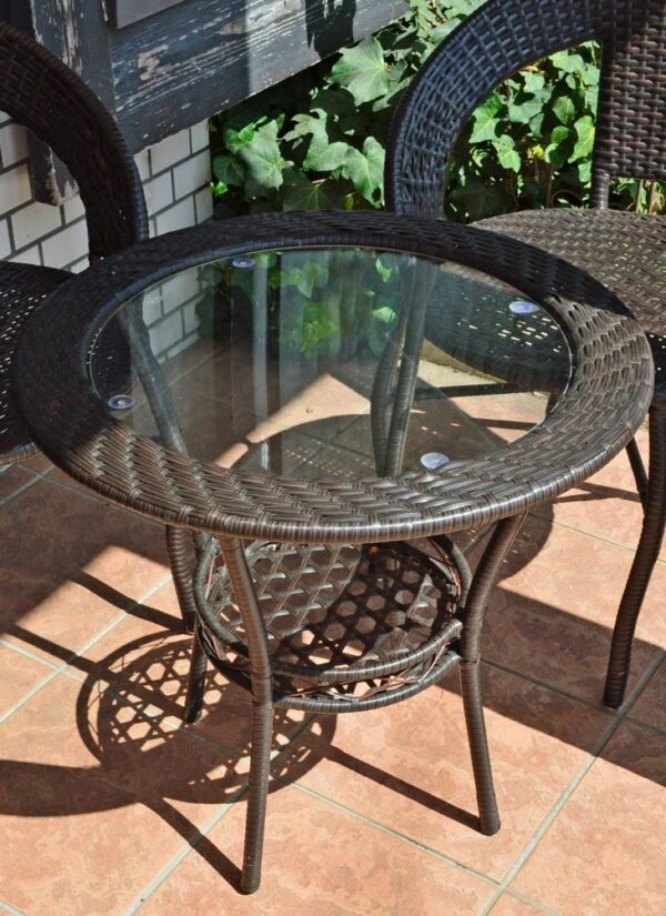 Изработен от висококачествен PVC ратан, комплектът е устойчив на вода и UV лъчи, което го прави идеален за целогодишна употреба на открито. Солидната метална рамка осигурява стабилност, а закаленият стъклен плот (8 мм) придава елегантен завършек на масата, като в същото време е лесен за почистване.