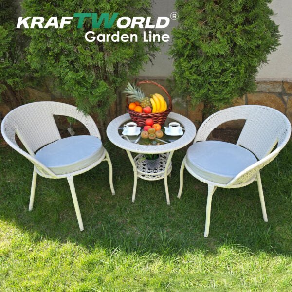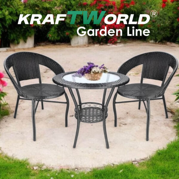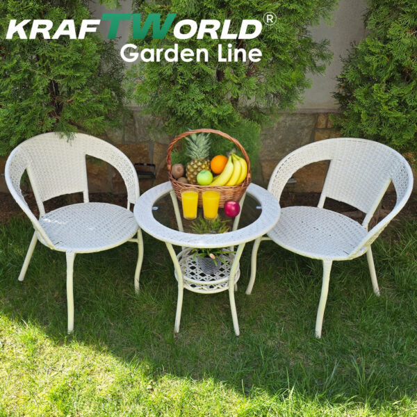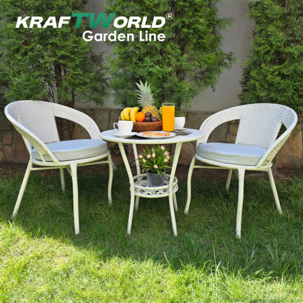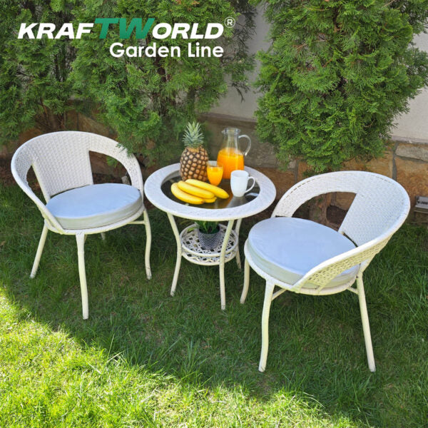 Комплектът Teresa включва 2 ергономични ратанови стола и кръгла маса със здрава конструкция, и удобен рафт.