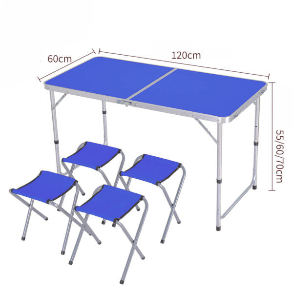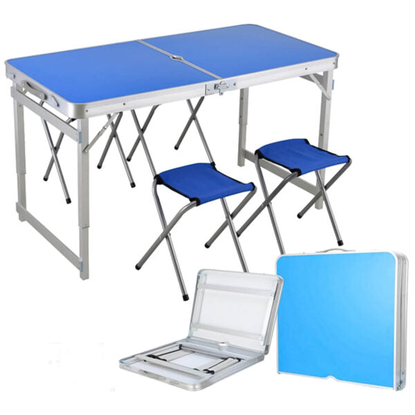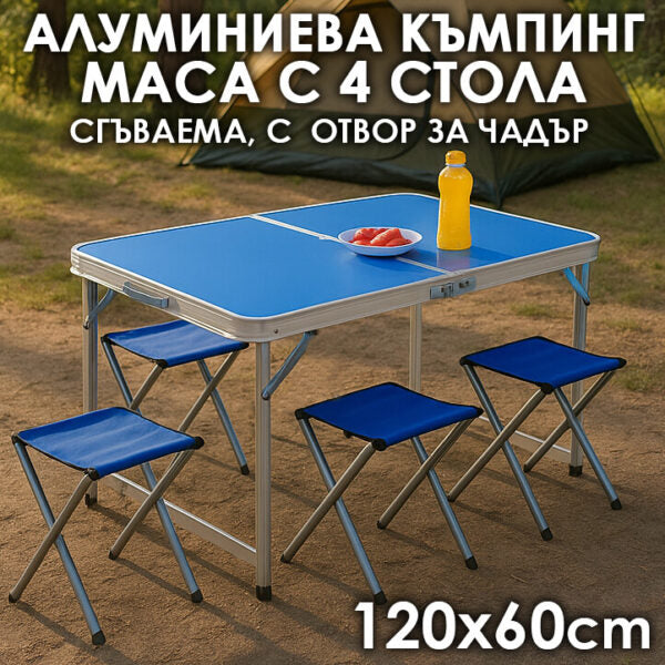 Сгъваема Алуминиева Маса с 4 Отделни Стола – 120×60 см, Тип Куфар, Синя