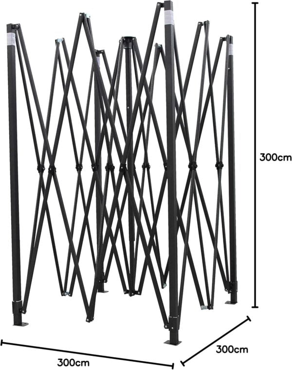 С размер 3×3 метра и височина 2,5 м, тя осигурява достатъчно пространство за настаняване на няколко души, маси и столове, правейки я идеална за събития на открито. Леката, но стабилна конструкция, както и компактният ѝ сгъваем дизайн, я правят удобна за транспортиране и съхранение.