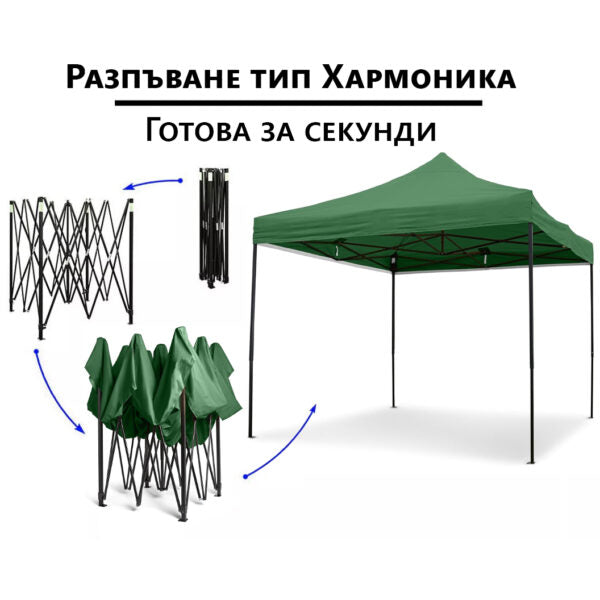 Едно от основните предимства на този модел е сгъваемият механизъм тип „Хармоника“, който позволява бързо и лесно разпъване – без нужда от допълнителни инструменти! Само с няколко движения шатрата е готова за употреба, а след събитието се прибира също толкова лесно.