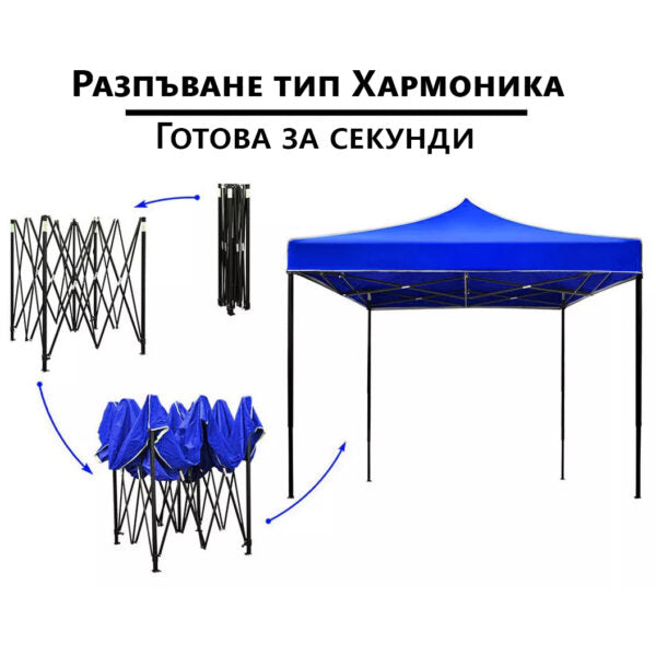 Едно от основните предимства на този модел е сгъваемият механизъм тип „Хармоника“, който позволява бързо и лесно разпъване – без нужда от допълнителни инструменти! Само с няколко движения шатрата е готова за употреба, а след събитието се прибира също толкова лесно.