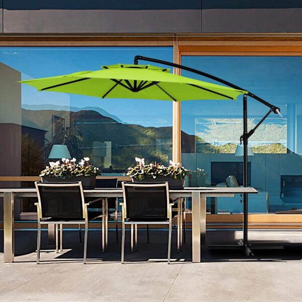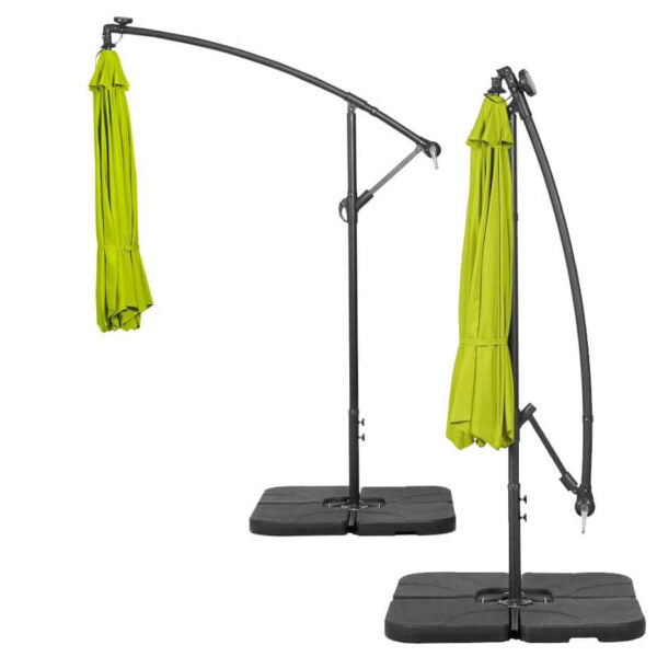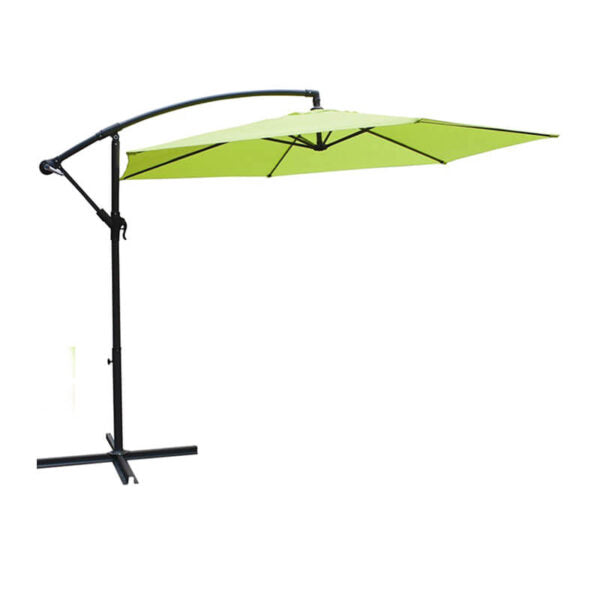 Изработен от висококачествен полиестер, устойчив на слънце и влага, платът не избледнява и осигурява UV защита по стандарт 801 UV Protect 80. Чадърът се отваря лесно с манивела, а висящата конструкция позволява свободно разположение на мебели под него, без пречещи стълбове по средата.