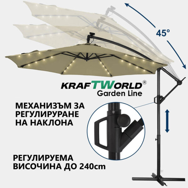 Преоткрий лятото с премиум градинския чадър Monaco – висящ модел с изискан бежов цвят, създаден да осигури не просто сянка, а стилна атмосфера и комфорт през целия ден… и нощта. Част от селекцията KraftWorld GardenLine, този модел комбинира елегантен дизайн, висококачествени материали и практична функционалност за изключително изживяване на открито.