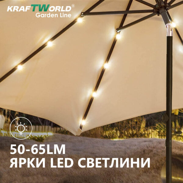 32 LED светлини, деликатно вградени в спиците, се захранват от соларен панел, осигурявайки меко и романтично осветление вечер, без нужда от кабели или електричество. Перфектно решение за вечерни събирания, градински вечери или ресторанти с открити зони.