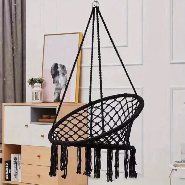 - Естетичен дизайн: Създадена с изящно изплетено памучно въже и допълнителни декоративни ресни, люлката е едновременно стилна и практична, вписвайки се перфектно в съвременния интериор.