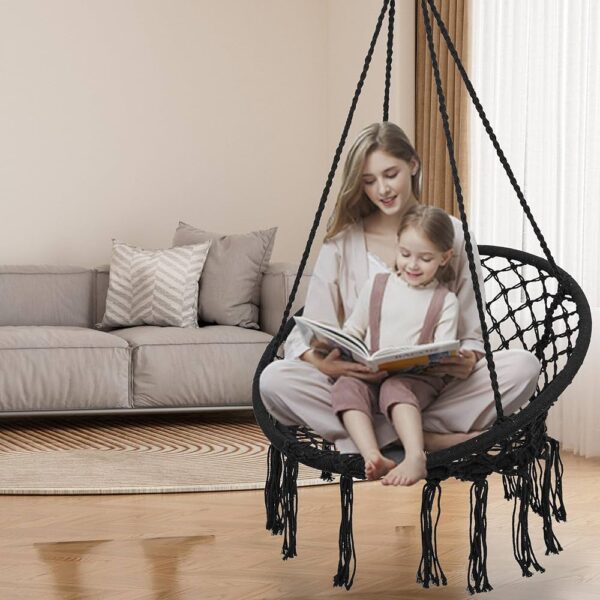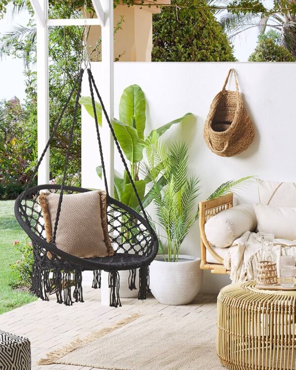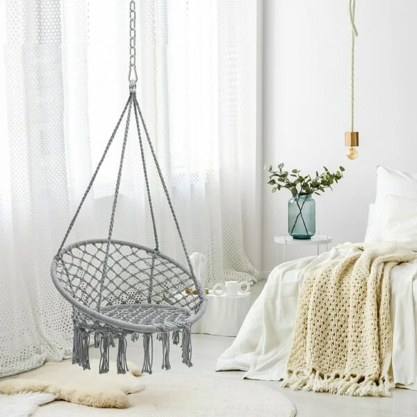 - Естетичен дизайн: Създадена с изящно изплетено памучно въже и допълнителни декоративни ресни, люлката е едновременно стилна и практична, вписвайки се перфектно в съвременния интериор.
